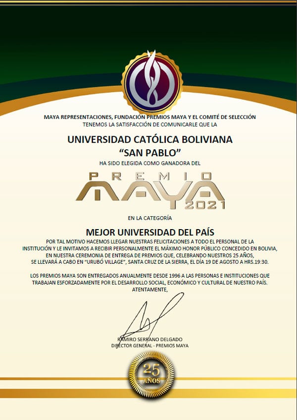 La Fundación Maya en su vigésima quinta edición ha otorgado a la Universidad Católica Boliviana el reconocimiento Maya 2021 como la mejor universidad de Bolivia por su excelencia académica, trayectoria institucional, interacción social y la innovación tecnológica en el campo de la educación superior.