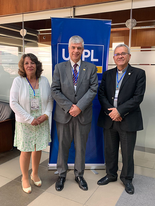 Representan a la U.C.B. “San Pablo”, P. José Fuentes Cano, Rector Nacional y la Dra. Ximena Peres Arenas, Rectora de Sede La Paz. En esta primera jornada la Dra. Ximena Peres, tendrá a su cargo la presentación del tema: “Apoyo psicológico y social durante la pandemia” y el día de mañana el Rector Nacional presentará el tema: “Herramientas para implementar la formación humanista cristiana en las universidades católicas”.