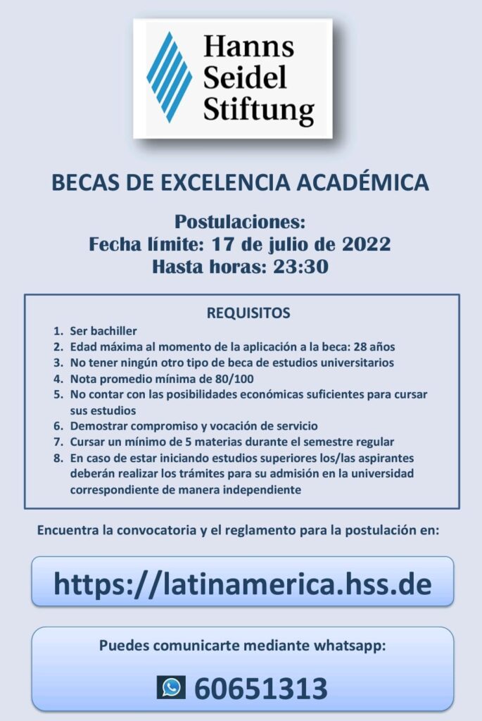 Becas de Excelencia Académica Hanns Seidel Stiftung Jul 4, 2022 https://latinamerica.hss.de Whatsapp: https://wa.me/59160651313