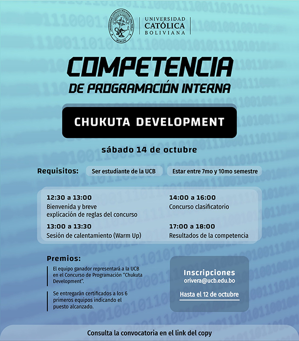 La Facultad de Ingeniería de la Universidad Católica Boliviana – San Pablo, convoca al concurso de programación interno, a realizarse el día 14 de octubre del presente. El objetivo de este concurso es identificar a los mejores estudiantes de nuestra Universidad para que nos representen en la competencia regional denominada “Chukuta Development”, organizada por el municipio Paceño y que se realizará a finales del mes de octubre del presente.