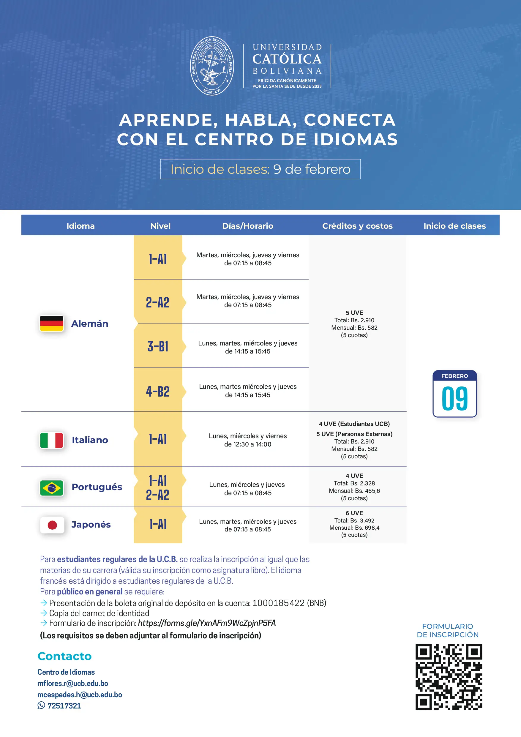 El Centro de Idiomas de la Universidad Católica Boliviana “San Pablo” coordina los cursos de inglés para sus estudiantes y ofrece cursos de idiomas: francés, portugués, italiano, alemán, chino y japonés con altos estándares internacionales, a sus estudiantes y al público en general interesado en mejorar el acceso a oportunidades de trabajo, estudio superior y desarrollo personal.