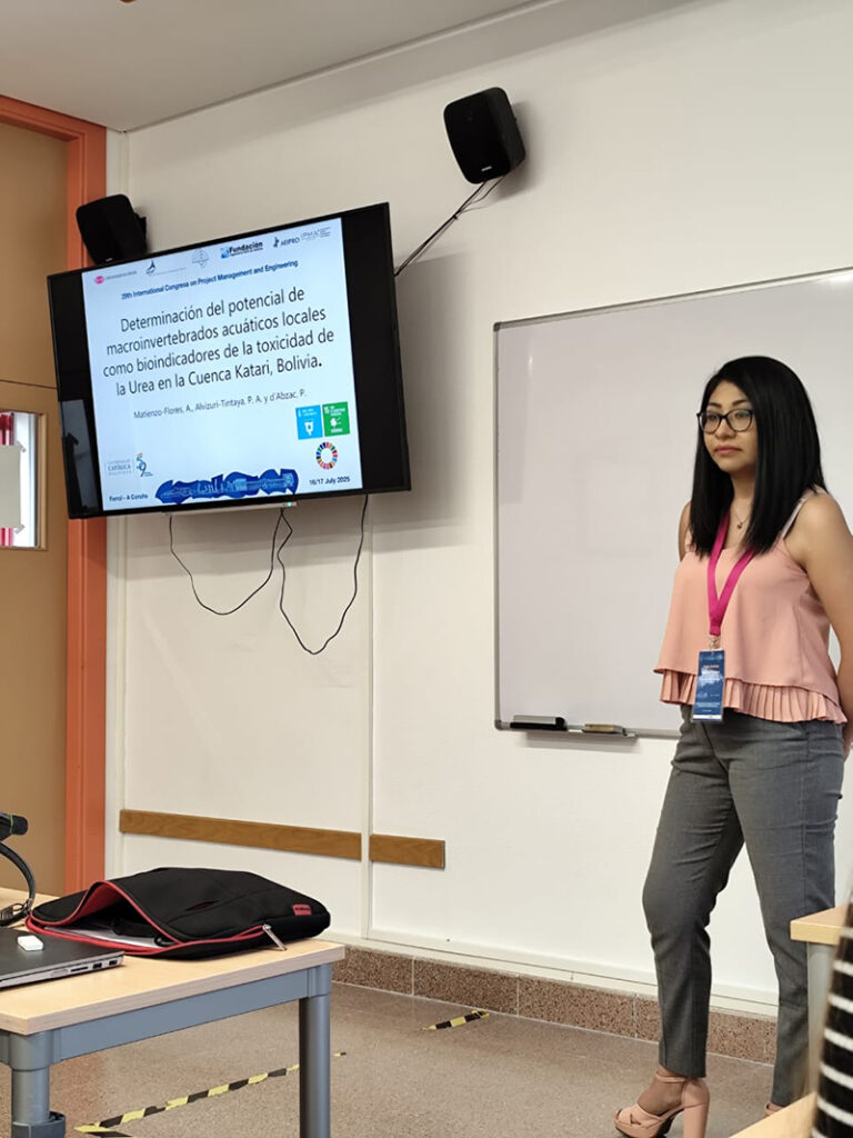La investigadora del Centro de Investigación en Agua, Energía y Sostenibilidad (Cinaes), Paola Alvizuri, participó del XXIX International Congress on Project Management and Engineering celebrado los días 16 y 17 de julio del presente en la Escuela Politécnica de Ingeniería de Ferrol, perteneciente a la Universidade da Coruña (España). Alvizuri presento tres ponencias orales. El Cinaes forma parte de la Carrera de Ingeniería Ambiental de la Universidad Católica Boliviana (U.C.B.) «San Pablo» Sede La Paz.