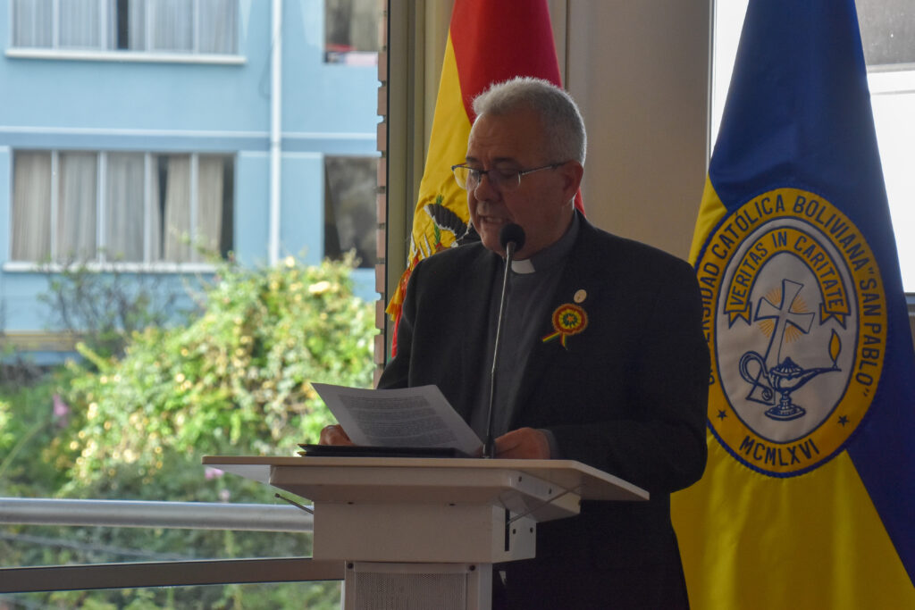 El rector nacional de la U.C.B., padre Jose Fuentes, también estuvo presente en el acto y destacó en su discurso que Bolivia  es una nación “compleja, viva y en constante construcción”, con una identidad “profundamente religiosa y cristiana”.