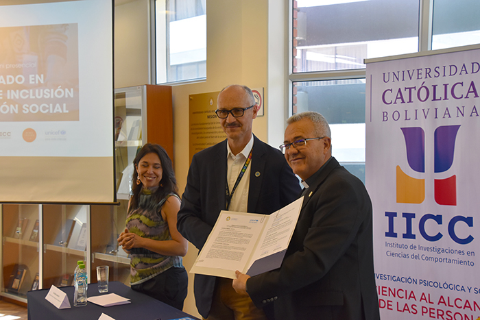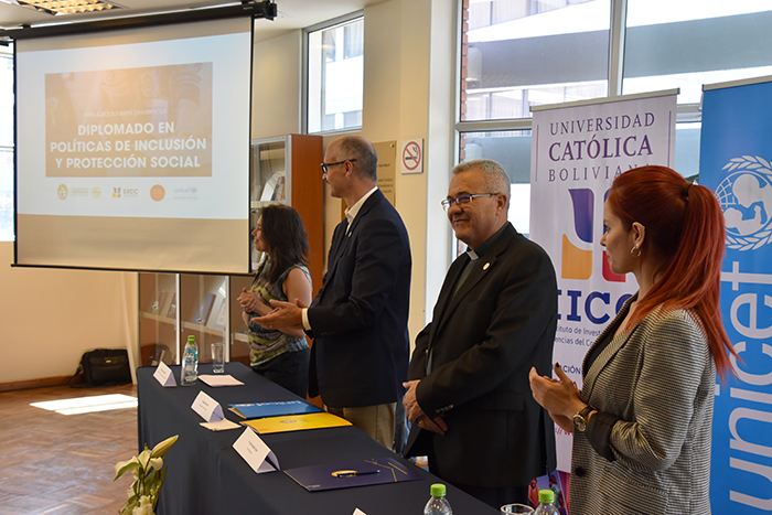 El Instituto de Investigaciones en Ciencias del Comportamiento (IICC) de la Universidad Católica Boliviana “San Pablo” en conjunto a UNICEF firmaron un convenio y realizaron el lanzamiento del primer “Diplomado en Políticas de Inclusión y Protección Social” que busca el reconocimiento de la protección social como una importante herramienta para garantizar los derechos de la niñez y la población.