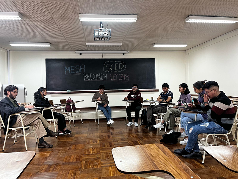 En un ejercicio de análisis y debate crítico, la Universidad Católica Boliviana (U.C.B.) «San Pablo» Sede la Paz fue escenario de una mesa redonda sobre la Ley 348, realizada de 10.45 a 12.15, con la participación de miembros de la Sociedad Científica de Derecho (SCED) y estudiantes de la Carrera de Derecho.