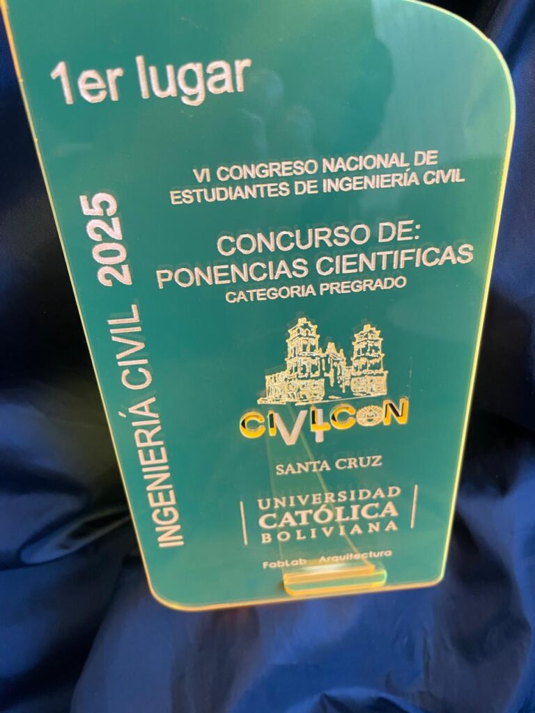 Así, el título completo de su investigación fue Frecuencias fundamentales bajo diferentes grados de fisuración, que por la calidad de contenido y por el nivel con el que fue expuesto ganó el concurso de ponencias científicas de la categoría pregrado de ese congreso nacional, organizado por la Carrera de Ingeniería Civil de la Universidad Católica Boliviana (U.C.B.) Sede Santa Cruz, realizado en el mes de octubre.
