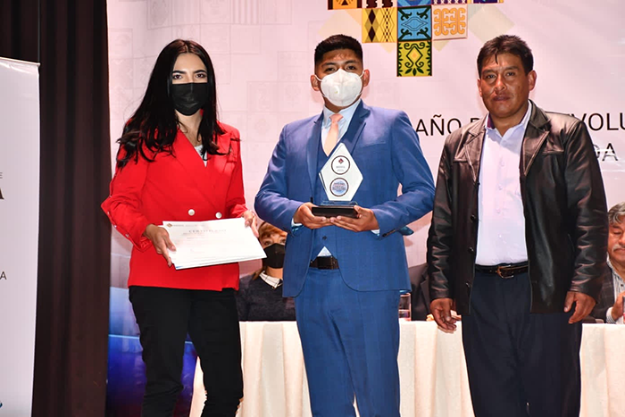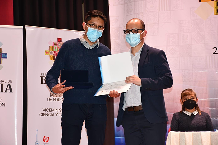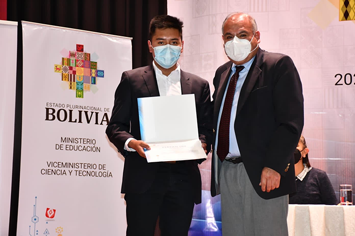 Primer lugar para el Ing. Sergio Martin Achacollo Gutierrez de Ingeniería Química en el área “Desarrollo agropecuario y tecnologías de alimentos” con el proyecto: PROTECCION UV DEL BACILLUS THURIGIENSIS PARA LA OBTENCION DE BIOINSECTICIDAS NATURALES.