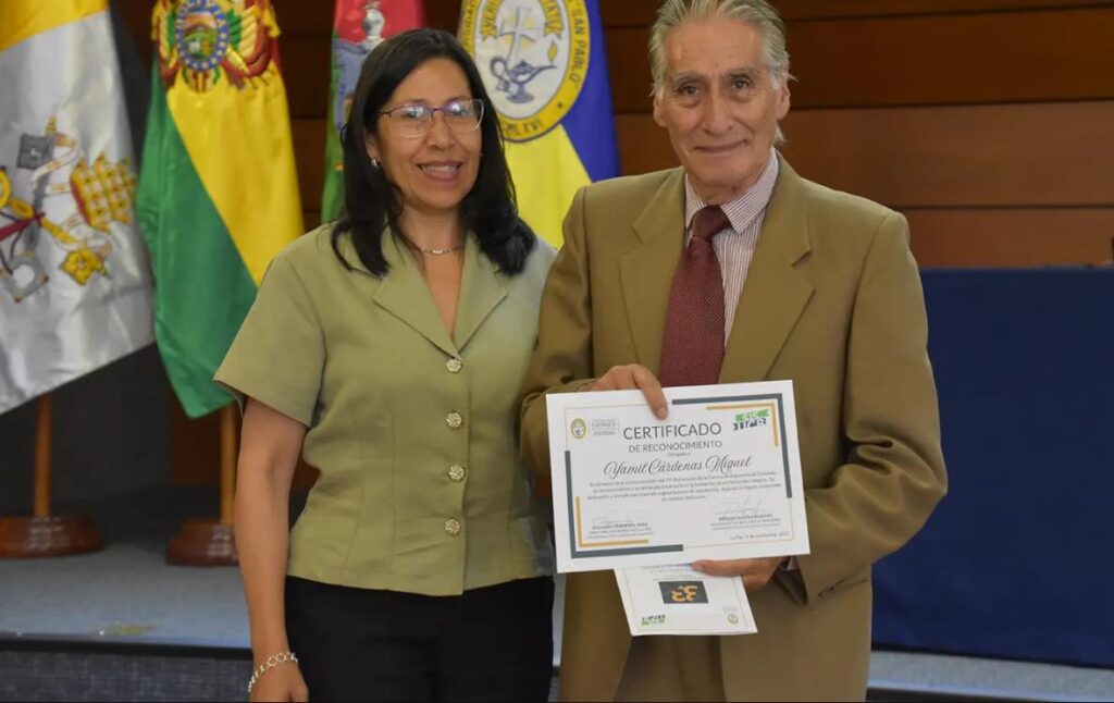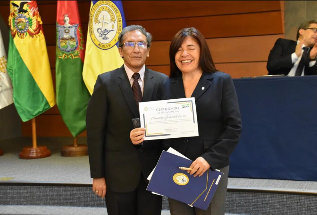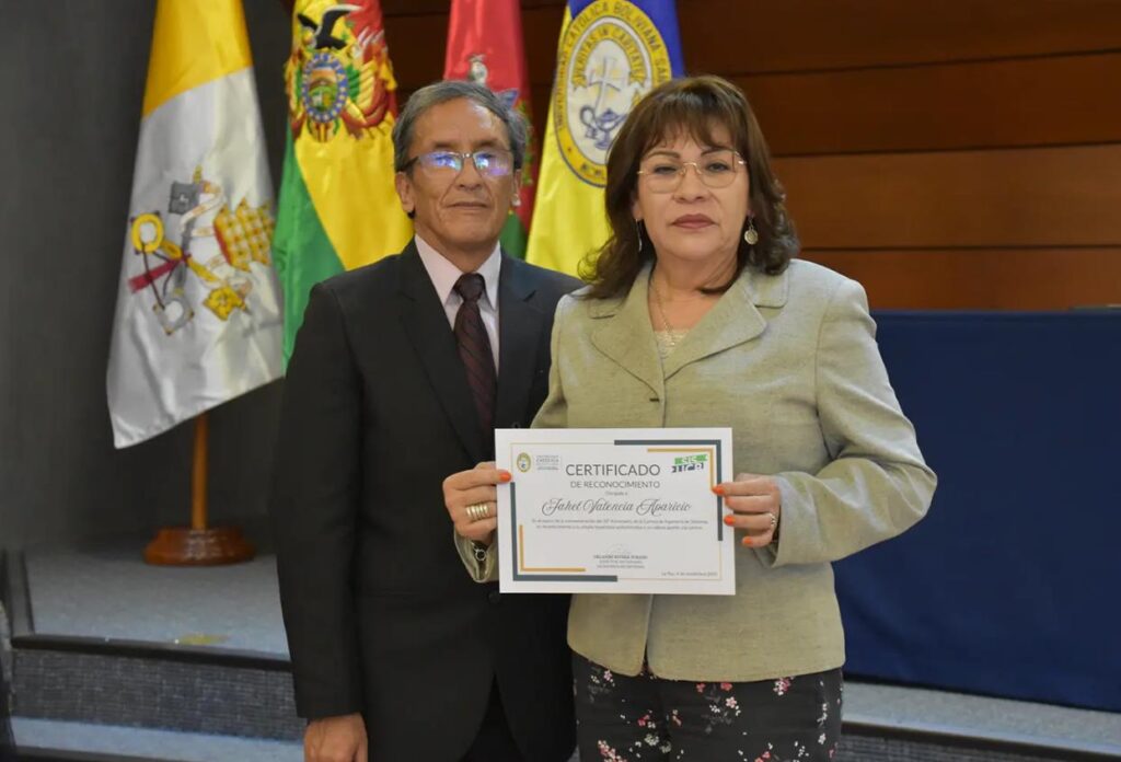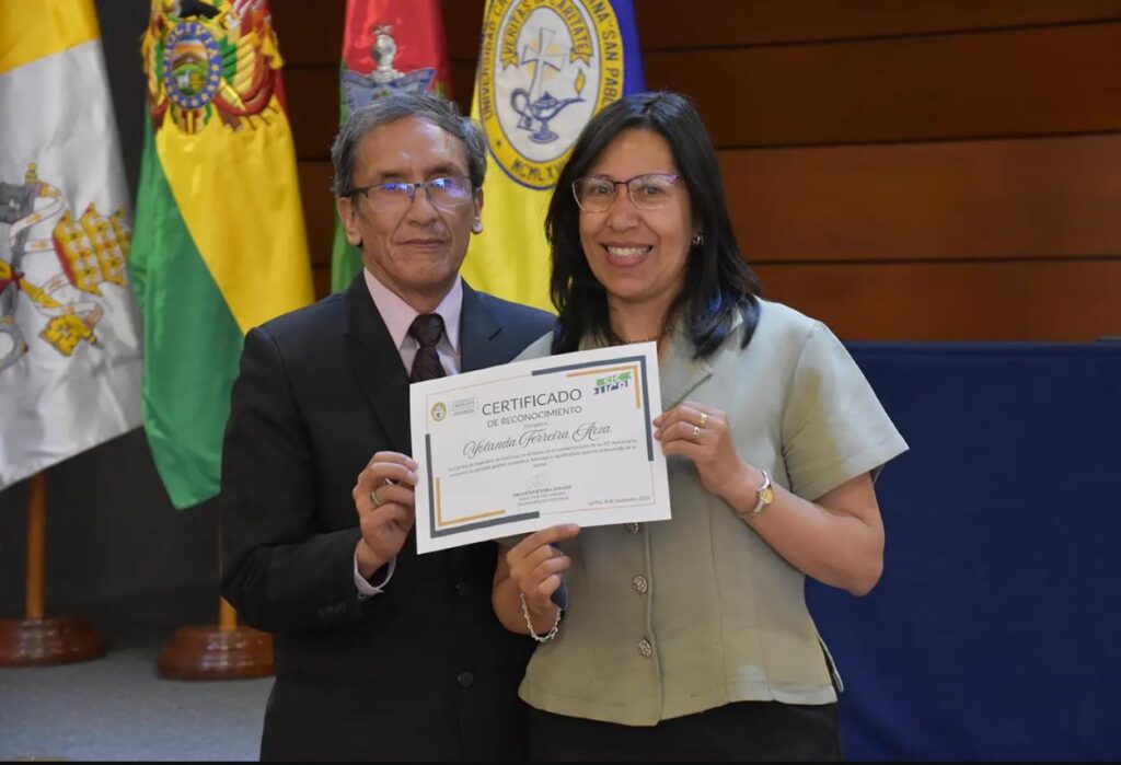 Finalmente, se distinguió la gestión académica y el liderazgo de rectora de Sede La Paz, Ximena Peres; la directora académica de Sede, Yolanda Ferreira; y el decano de la Facultad de Ingeniería, Renán Laguna,
