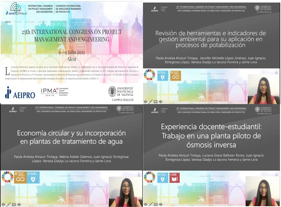 Adicionalmente, la Ing. Alvizuri participo de manera virtual del 25th International Congress on Project Management and Engineering presentando cinco artículos. Tres artículos como primer autor en coautoría con alumnas de la Carrera de Ingeniería ambiental, motivando el espíritu de investigación en jóvenes investigadoras. Además contribuyo en otros dos artículos figurando como segundo autor. Estos artículos se encuentran indexados en Scopus y disponibles en: