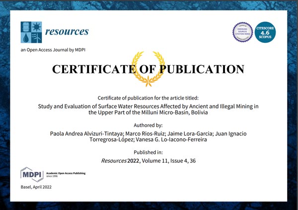 “Study and Evaluation of Surface Water Resources Affected by Ancient and Illegal Mining in the Upper Part of the Milluni Micro-Basin, Bolivia “ , publicada en el journal Resources , https://doi.org/10.3390/resources11040036