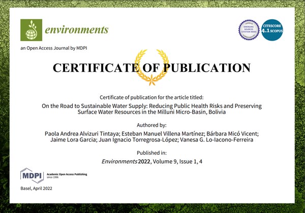 “On the Road to Sustainable Water Supply: Reducing Public Health Risks and Preserving Surface Water Resources in the Milluni Micro-Basin, Bolivia “, publicado en el Journal Environments, https://doi.org/10.3390/environments9010004