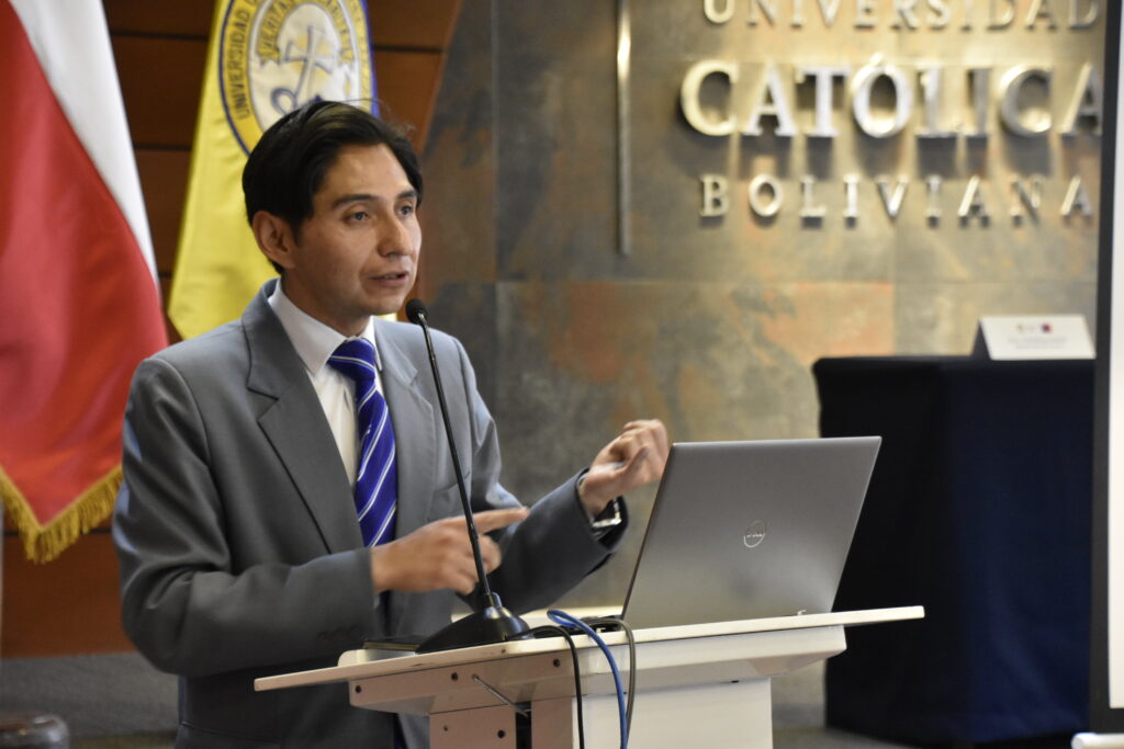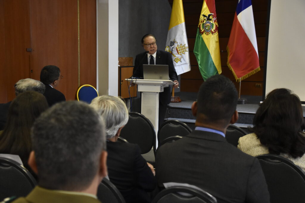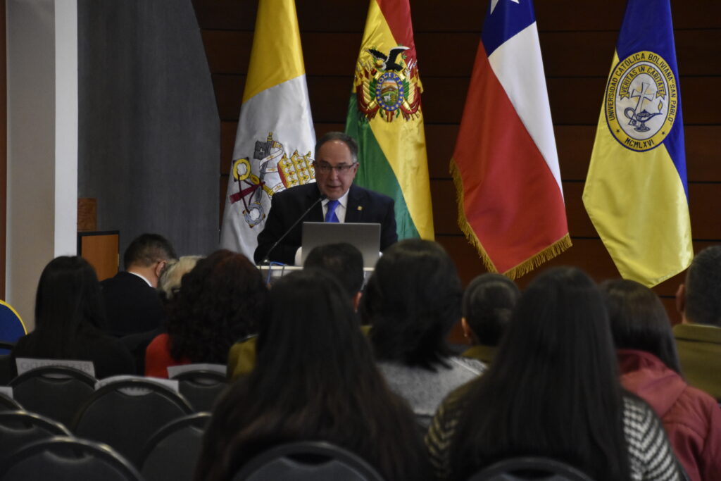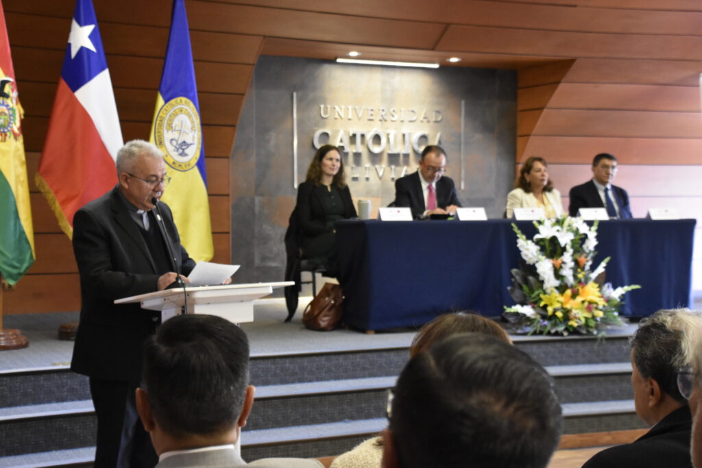 El último discurso del acto inaugural estuvo a cargo del rector nacional de la U.C.B., padre José Fuentes, quien expresó: “Hoy nos convoca un propósito común; abrir un diálogo profundo y constructivo sobre la política exterior entre Bolivia y Chile en un contexto internacional que nos desafía a buscar caminos de entendimiento, cooperación y paz”.