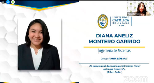 Las autoridades de la Unidad Académica Regional La Paz de la Universidad Católica Boliviana “San Pablo” otorgaron la Beca Bachiller a dos notables estudiantes, Diana Aneliz Montero Garrido, de la carrera de Ingeniería de Sistemas y a Valeria Nicole Rodríguez Sagaline, de la carrera de Economía e Inteligencia de Negocios. Ambas estudiantes fueron beneficiadas con el 100% de beca durante toda la carrera en mérito al extraordinario desempeño académico logrado durante sus estudios secundarios y el sobresaliente puntaje obtenido en el examen de selección realizado para este propósito.