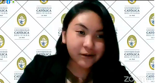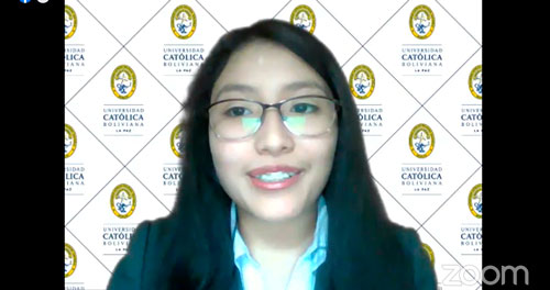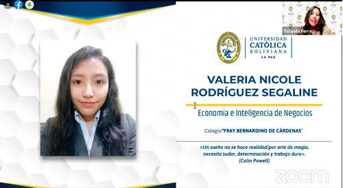 Valeria Nicole Rodríguez Sagaline, de la carrera de Economía e Inteligencia de Negocios hizo sus estudios en el colegio Fray Bernardino de Cárdenas, con un ameno discurso agradeció la oportunidad y dedico este importante logro a sus padres, así también demostró su alegría y agradecimiento a la universidad “(…) estoy muy feliz de poder continuar con mi formación académica y espiritual, doy mi palabra de que seguiré con el mismo ímpetu de superación que me ayudará a superar mis metas.”