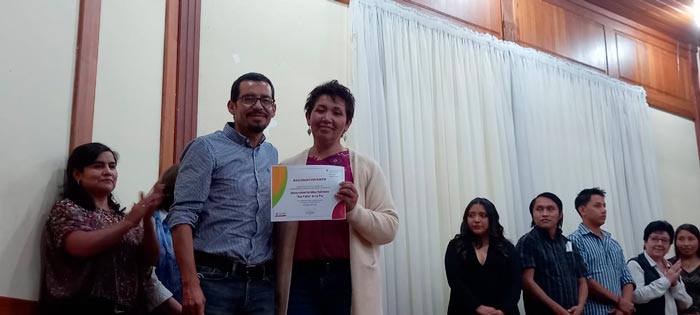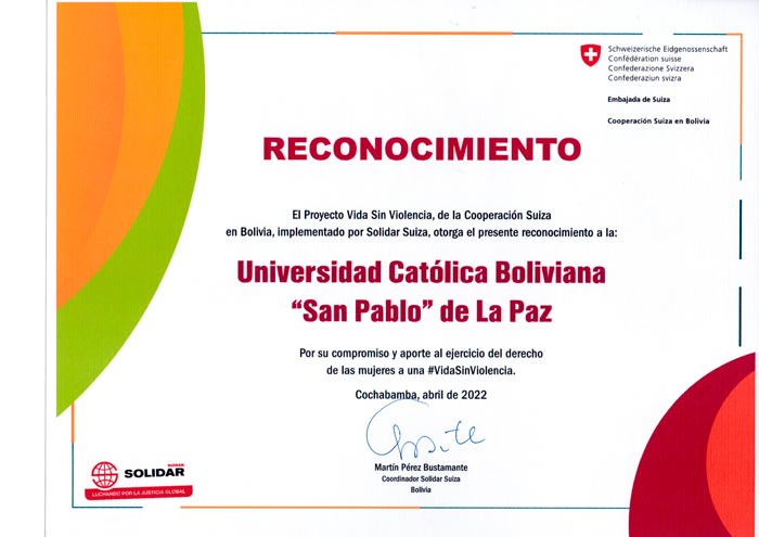 Por el trabajo desarrollado, la UCB recibe el reconocimiento del Proyecto “Vida sin Violencia de la Cooperación Suiza en Bolivia, implementado por Solidar Suiza por el grupo de representación de eduactivistas UCB en el encuentro nacional en la ciudad de Cochabamba conformado por: