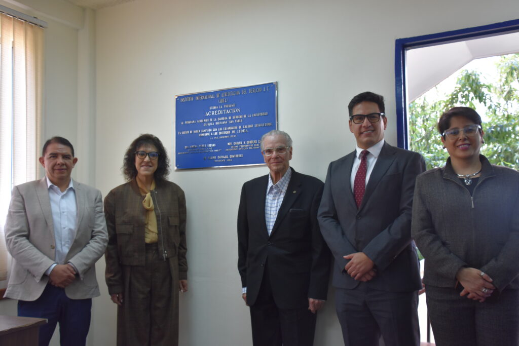 En la visita, se destacó la acreditación internacional obtenida en 2021 por la Carrera de Derecho de la U.C.B., otorgada por el Instituto Internacional para la Acreditación del Derecho (Iidea), organismo que pertenece a Afeidal. El hecho representa un hito que impulsó el mejoramiento curricular, la formación docente y el prestigio académico.