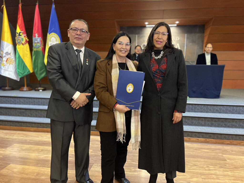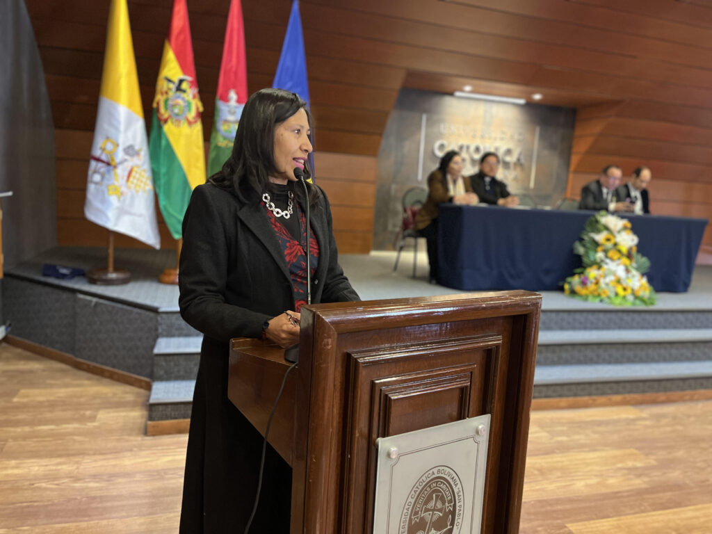 En el cierre de la ceremonia académica, la rectora de Sede en funciones dijo sentirse “emocionada por el resultado”, al recordar que es graduada de la Carrera de Psicología de la U.C.B., y agregó que el proceso de evaluación “nos ha mirado de una manera profunda y objetiva” para señalar el camino a seguir.