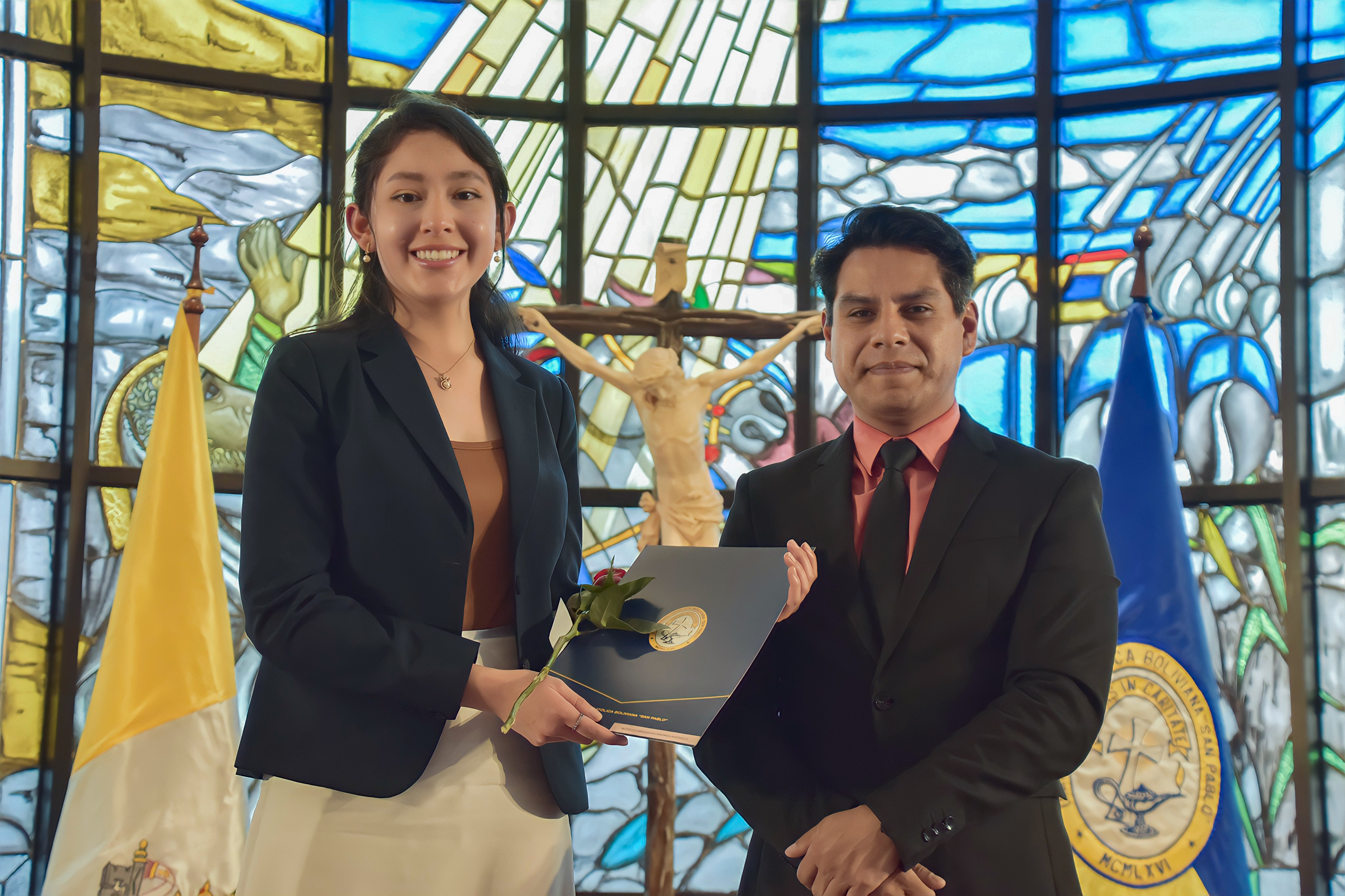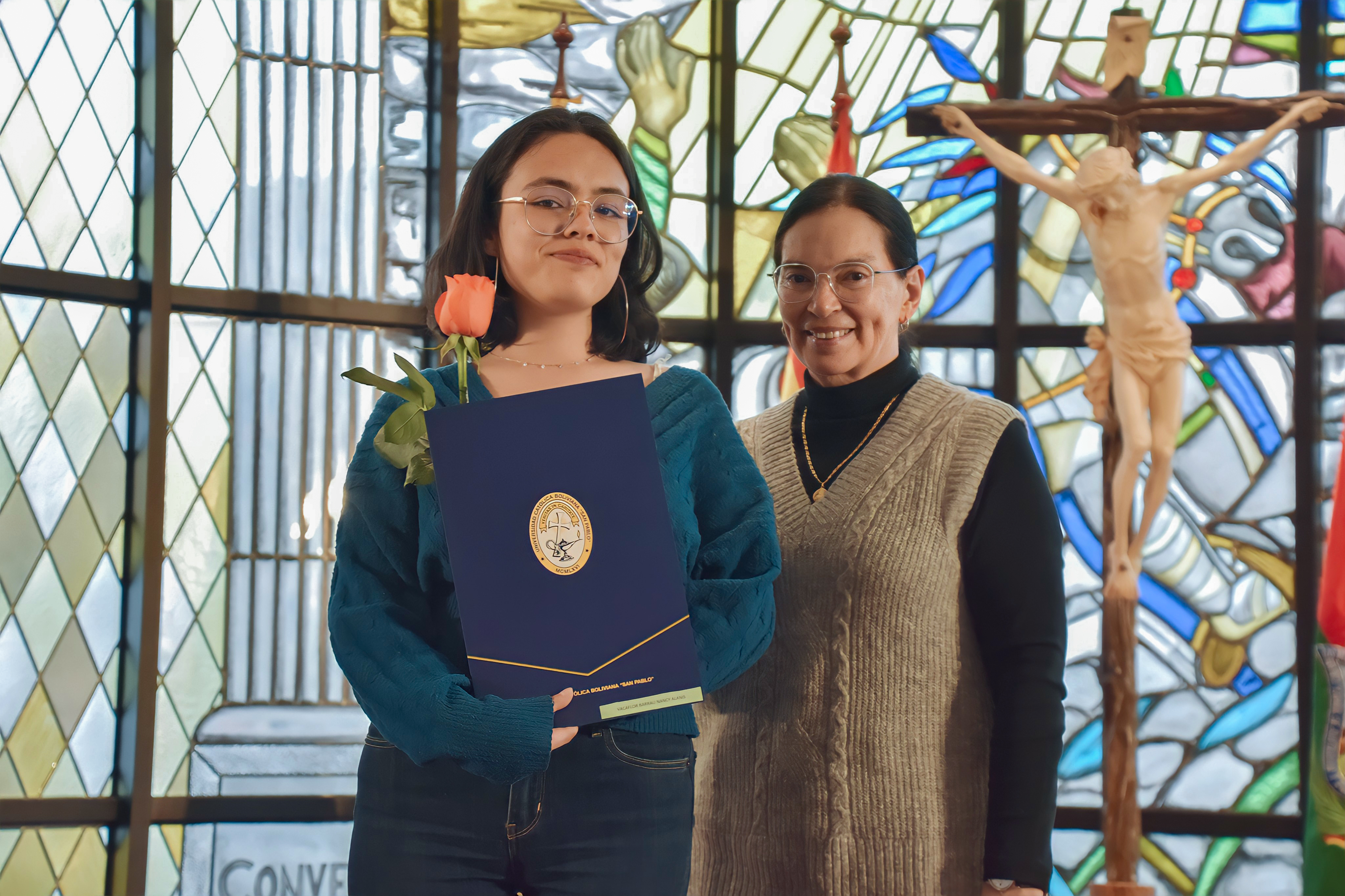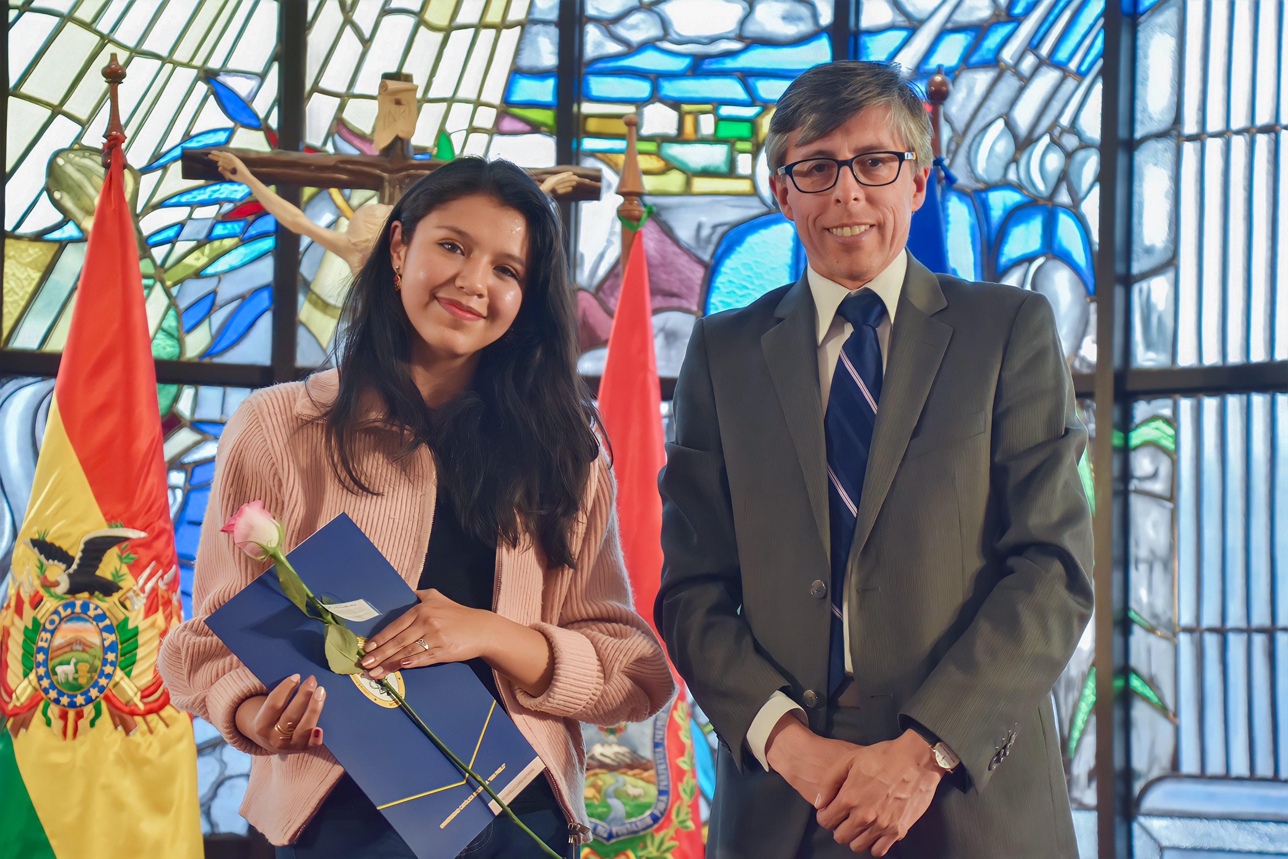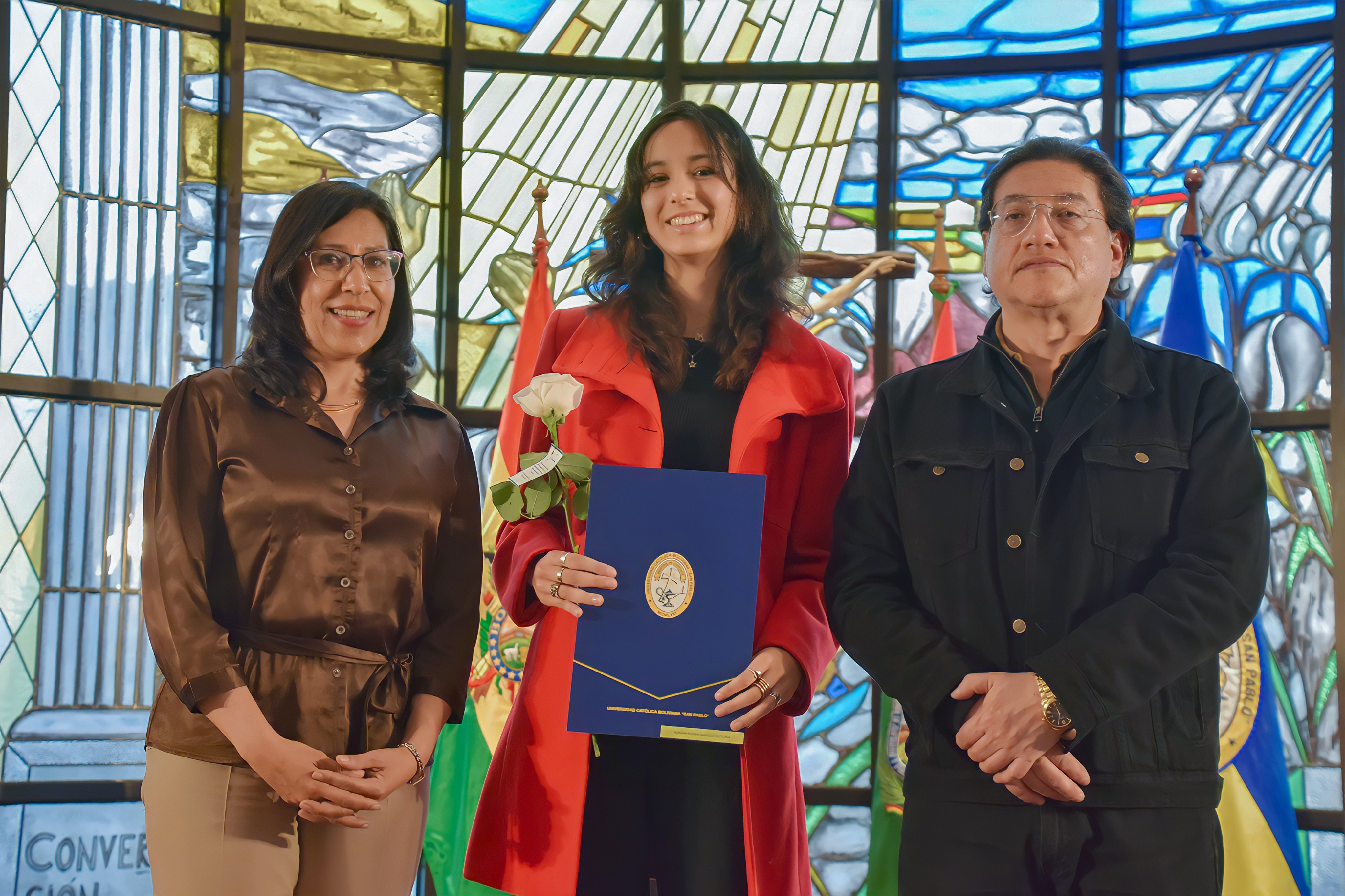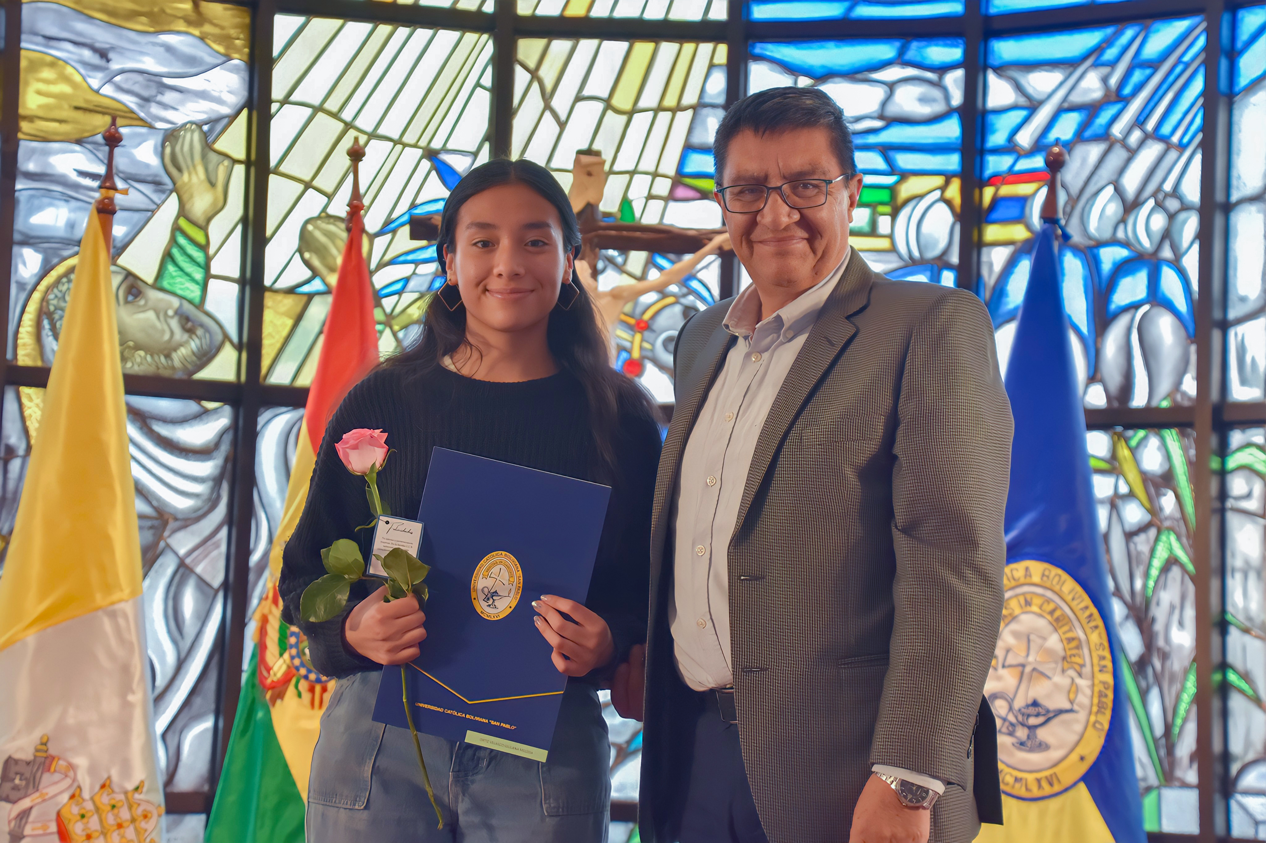 La rectora en funciones de Sede, Yolanda Ferreira; la becada Isabella Román ; y el padre Armando Sejas, director de la Pastoral.