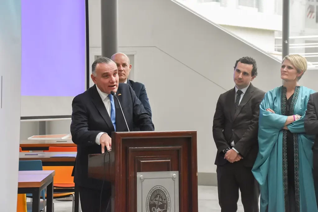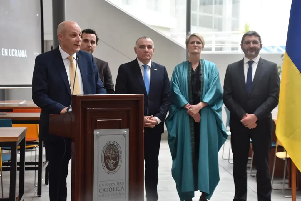 La Universidad Católica Boliviana “San Pablo” (U.C.B.), sede La Paz, realizó una actividad académica dedicada al análisis del conflicto en Ucrania, en el marco del cuarto aniversario del inicio de la guerra. El evento reunió a autoridades académicas, representantes del cuerpo diplomático acreditado en Bolivia, estudiantes y público en general.